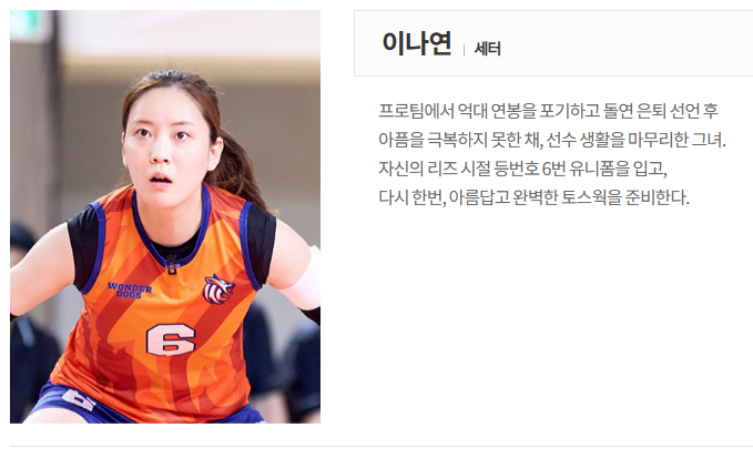 특히 이나연 선수는 2018년 FA 이고은 선수와의 트레이드 경험도 있는 등, 프로 생활 동안 여러 번의 변화를 겪었음에도 불구하고 항상 변치 않는 열정과 투지를 보여왔습니다. 이러한 굳건함이야말로 '재도전'을 꿈꾸는 필승 원더독스에 가장 필요한 자질입니다.